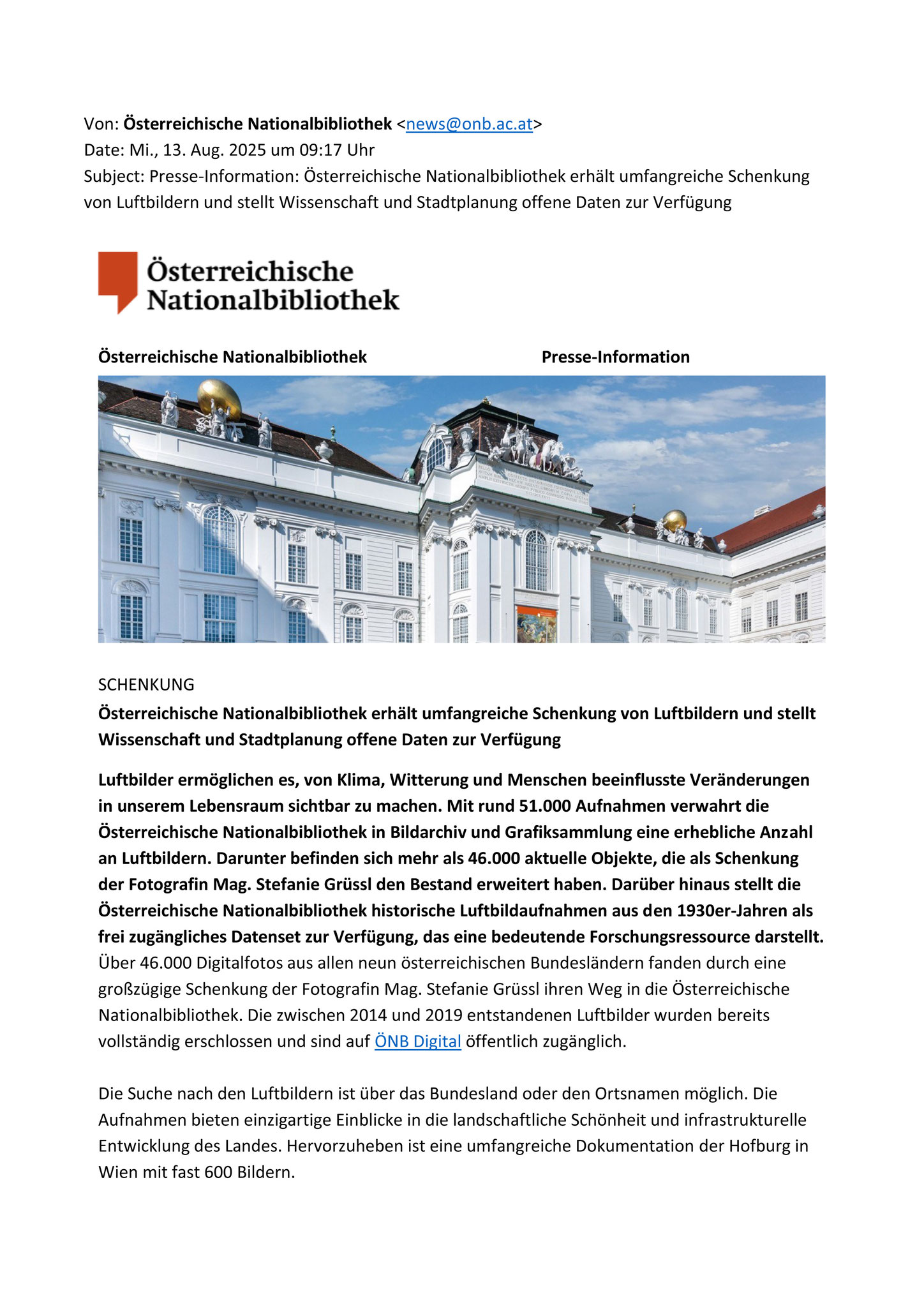 Redaktion Österreichisches Pressebüro: Österreichische Nationalbibliothek erhält umfangreiche Schenkung von Luftbildern und stellt Wissenschaft und Stadtplanung offene Daten zur Verfügung | Redaktion Österreichisches Pressebüro