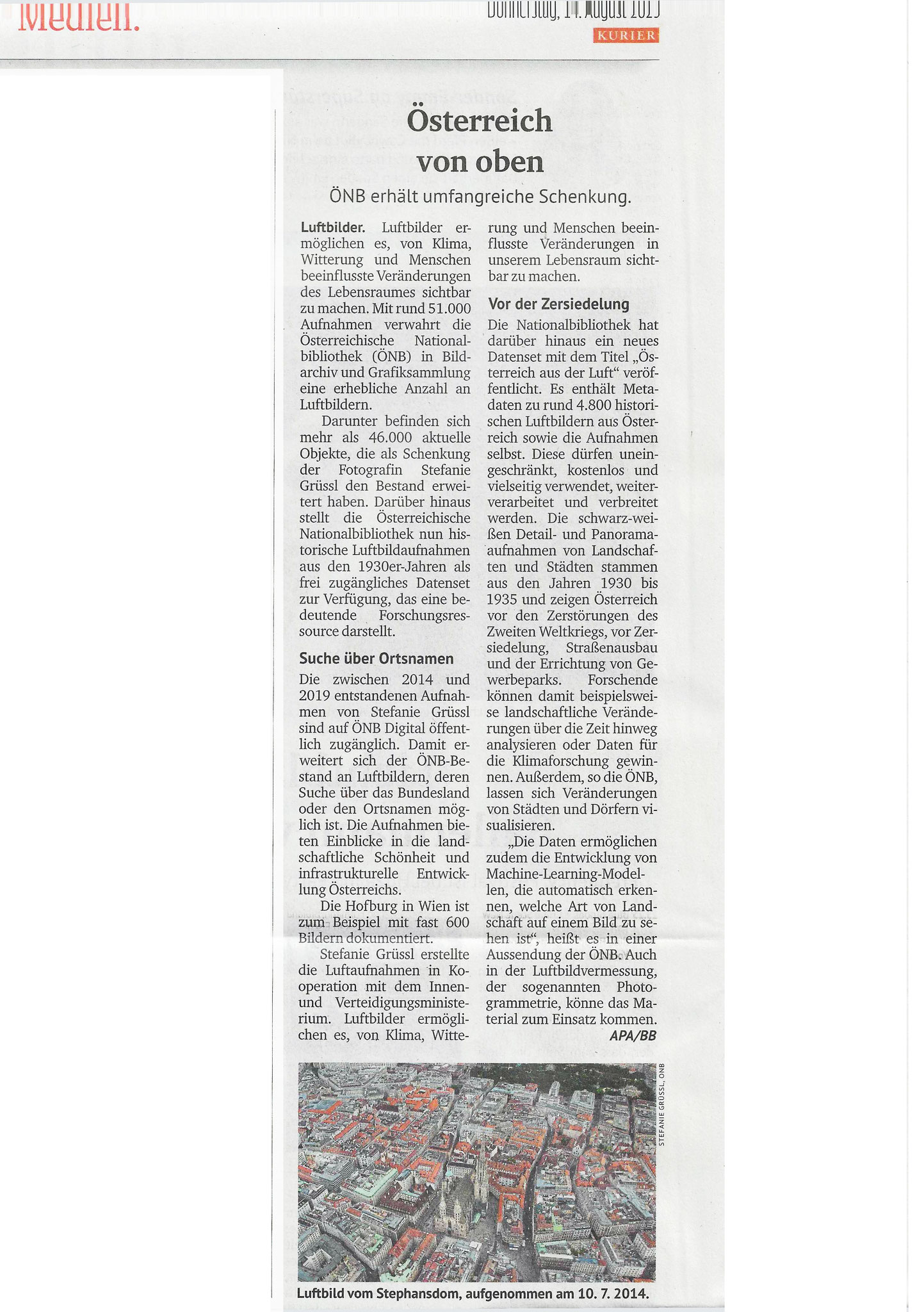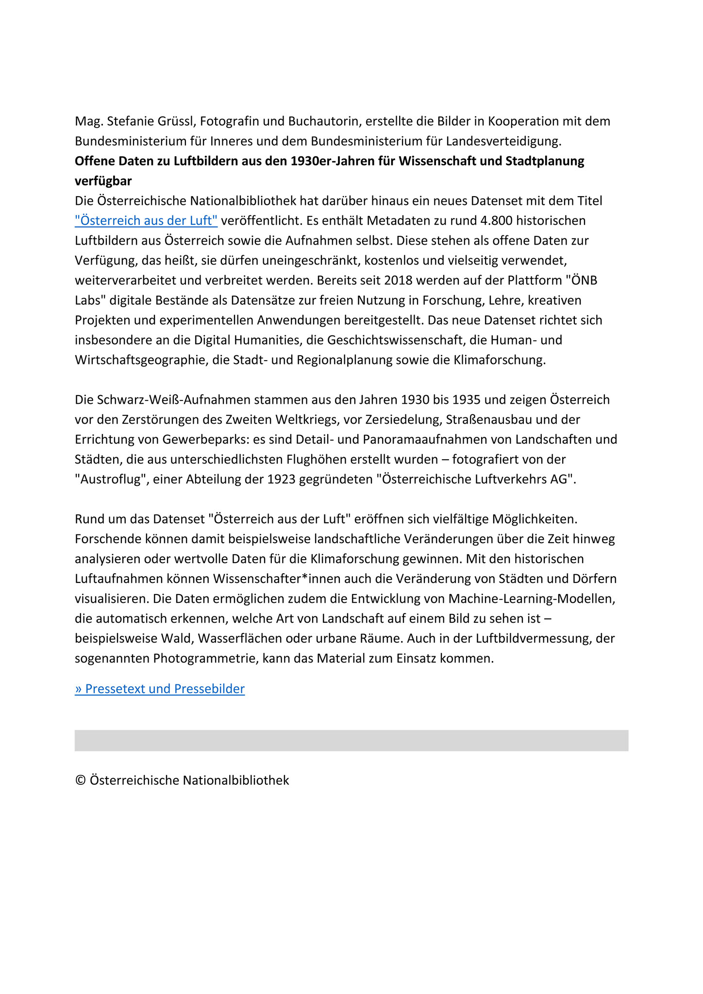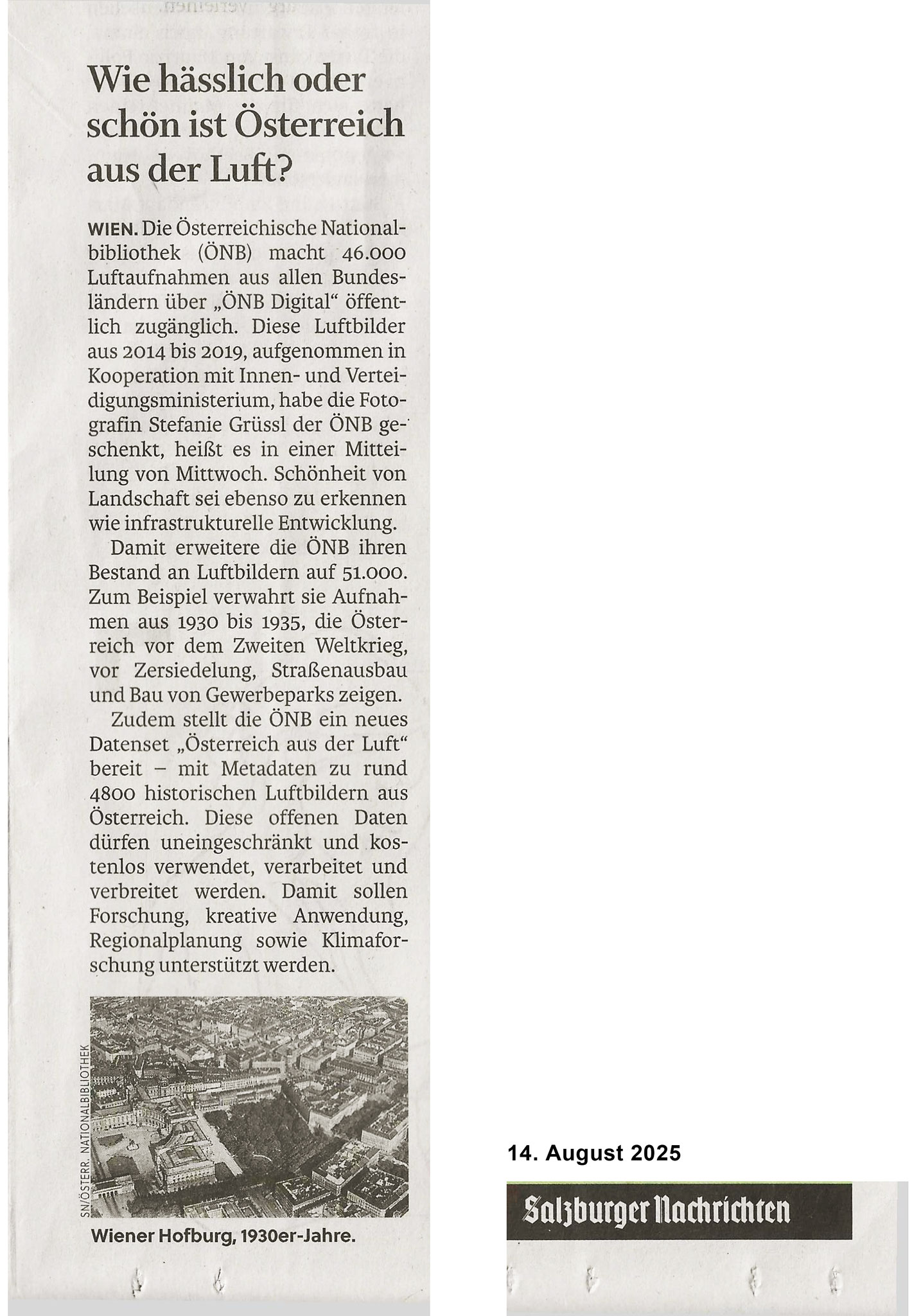 Durch die Kooperation mit der Österreichischen Nationalbibliothek finden sich eine große Anzahl an Luftbildern von Stefanie Grüssl in deren online Bilddatenbank unter: ÖNB Digital (onb.digital)